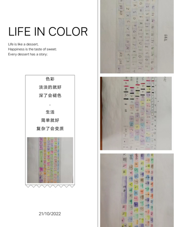 通過這次活動(dòng),同學(xué)們對(duì)鍵盤上每個(gè)按鍵的位置以及功能都有了更深刻的認(rèn)識(shí),史麗寧同學(xué)說她的打字速度通過這次活動(dòng)有所提升,之前每分鐘16個(gè)字,現(xiàn)在提高到每分鐘26個(gè)字。這堂課程也是對(duì)學(xué)生審美能力的測(cè)評(píng),考驗(yàn)學(xué)生們對(duì)顏色搭配的使用,使得學(xué)生對(duì)于鍵盤的排列更加了解,在使用中不會(huì)造成“一指彈”的情況。