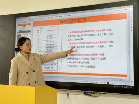 該次教學(xué)活動(dòng)主要圍繞“思政是什么”“如何挖掘?qū)I(yè)課程中的思政元素”展開學(xué)習(xí)和探討。結(jié)合教育部關(guān)于印發(fā)高校課程思政建設(shè)指導(dǎo)的通知,以及空乘專業(yè)課程的設(shè)置,劉老師從家國情懷、三觀塑造、專業(yè)精神、社會(huì)發(fā)展四個(gè)方面聚焦分析了專業(yè)課程中的思政元素。