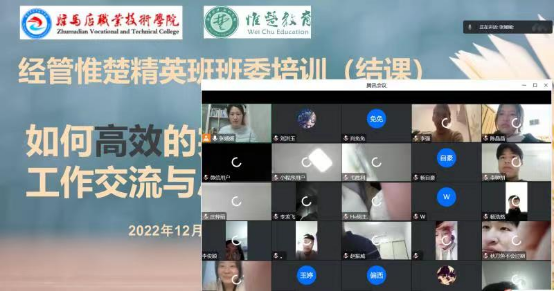 為不斷完善班集體的管理方法,12月16日晚,惟楚教育駐馬店職業(yè)技術(shù)學(xué)院校區(qū)通過線上方式舉行“學(xué)會(huì)總結(jié)與規(guī)劃”主題班委培訓(xùn)會(huì),學(xué)生全體班干部均參加,惟楚教育駐職院校區(qū)負(fù)責(zé)人鄒志主任、各輔導(dǎo)員老師出席了本次培訓(xùn)會(huì)。